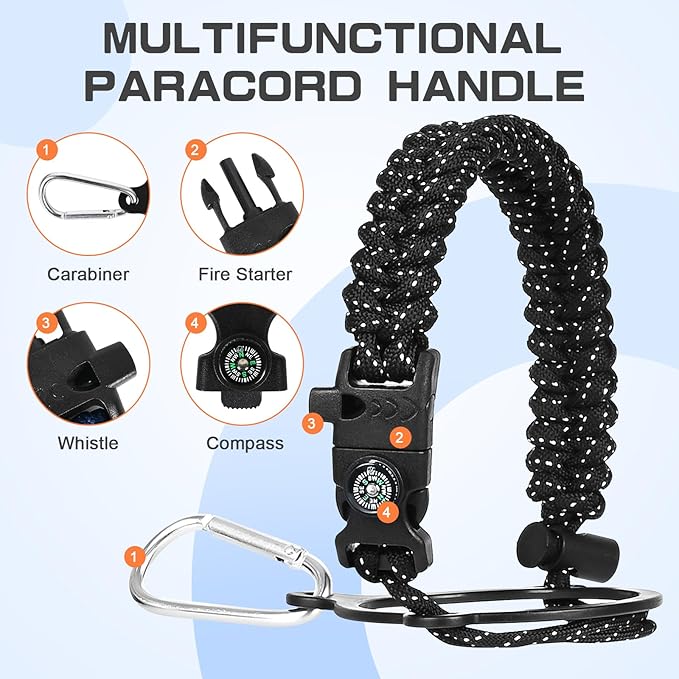- Full-function Paracord - With brilliant matching colors brings a touch of youthful vibe to the jugs. As a sturdy survival handle it comes with a carabiner, compass, fire starter and whistle, perfect for your wild adventures.
