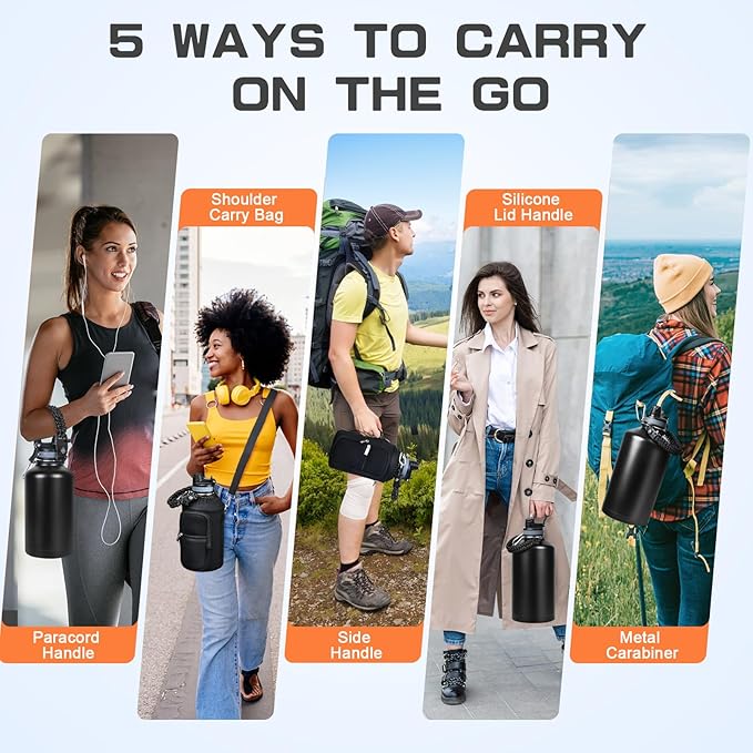 1 Gallon Water Bottle Insulated, Leak Proof 128 oz Stainless Steel Water Jug with Straw/Spout 2-in-1 Lid, Sleeve, Paracord Handle, Silicone Boot, One Gal Metal Canteen for Gym Sports Camping
