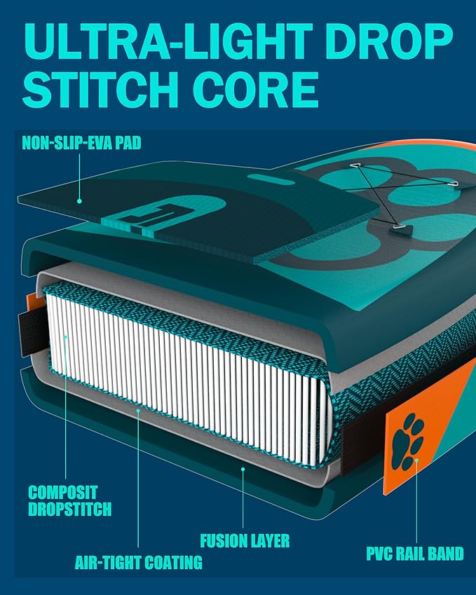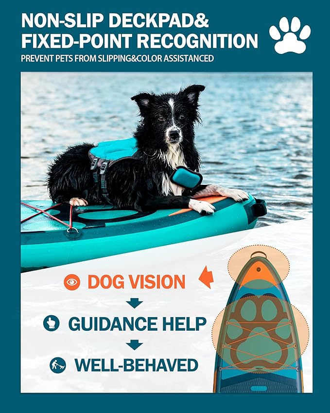 - 【Anti-slip & Anti-scratch Pad】Non-slip EVA deck pad of the inflatable paddle board is covered at the forth end,makes sure your dog doesn't go sliding off when you hit a wave.The important feature is anti-scratch pad for dog, making a dog stay on the front of the paddle.