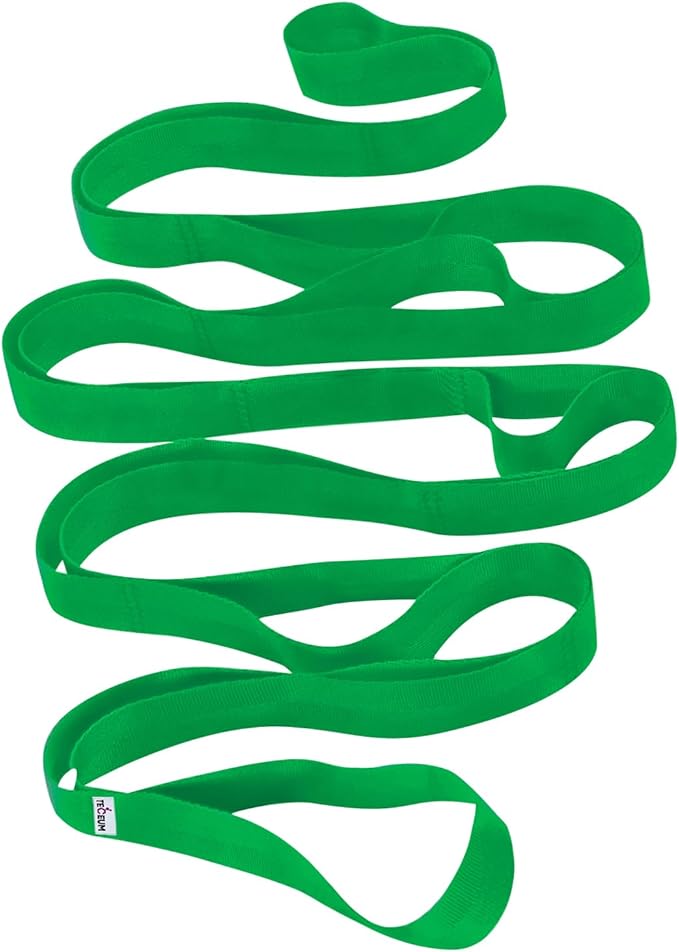 - STRETCHING STRAP. Color: GREEN. Material: POLYPROPYLENE. Width: 1.5 IN. Length: 79 IN. 10 Loops. Non-elastic. Superior Non-slip Grip.