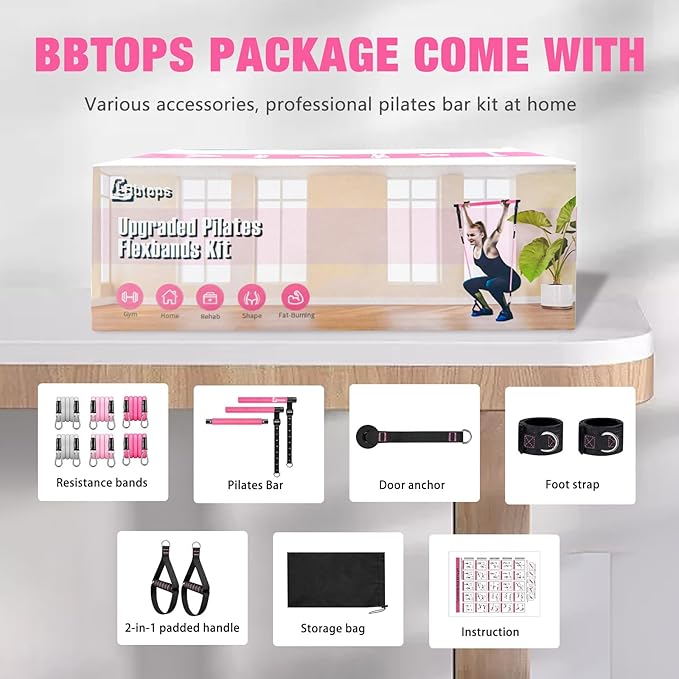 - 【Easy to Use】Upgraded Bbtops Pilates Flexbands Kit can be used for yoga, pilates, stretching, fitness and other training programs, exercising your arms, legs, buttocks, waist, neck and back. As long as you use it to do different movements, you can shape and maintain a perfect figure. Door anchor, handles, and ankle straps enrich your exercise methods,meet the needs of various exercises for you.