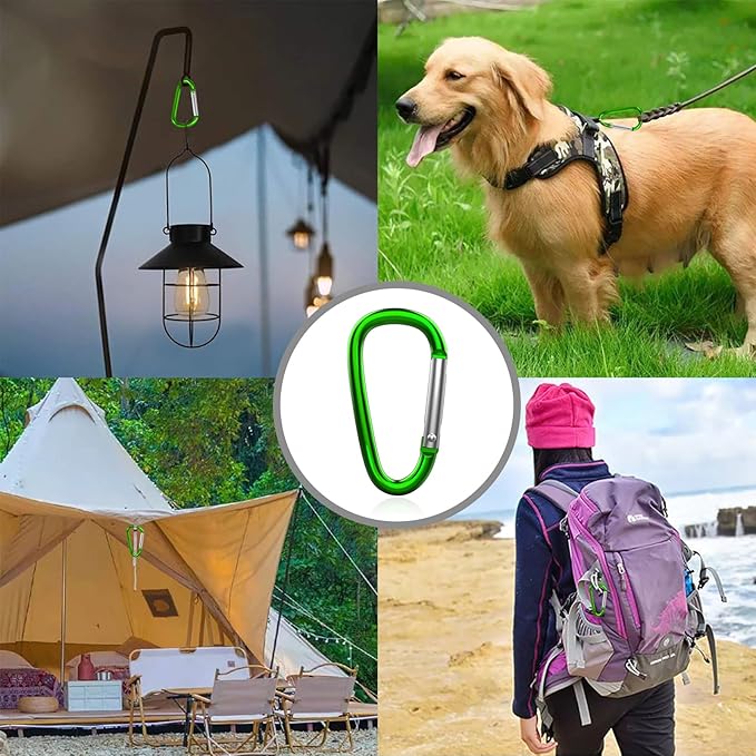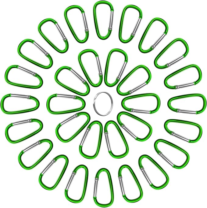 - 【Design】-Green Aluminum Caribeener Clips, Silver Steel Ring. Spring-Loaded Closing Gate Makes it smoothly to open and close. Coloring through an oxidation process, which makes it very difficult to fade/rust, except scratching.