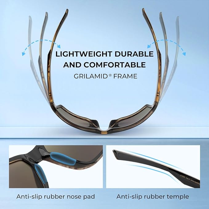 • PREMIUM FRAMES – Made from the same Grilamid material commonly used in military and medical applications, KastKing sunglass frames are lightweight, extremely flexible, and heat and UV resistant. Grilamid frames are well known for their astounding strength, lightweight, comfort, shape integrity, and impact resistance. This virtually indestructible ultra-lightweight and malleable material translates to an amazingly comfortable fit and the tacky nose pads prevent slipping.