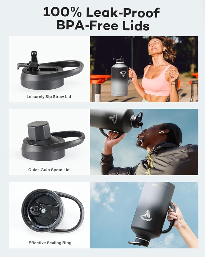 - No Leakage, No Spills: Our stainless steel water bottles comes with a dust-proof flip straw lid and a spill-free spout lid, both 100% leak-proof and spill-proof. The two lids showcase a vibrant color-contrast design, harmonizing with the bottle body's color and adding an extra touch of allure.