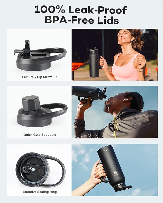 - No Leakage, No Spills: Our stainless steel water bottles comes with a dust-proof flip straw lid and a spill-free spout lid, both 100% leak-proof and spill-proof. The two lids showcase a vibrant color-contrast design, harmonizing with the bottle body's color and adding an extra touch of allure.