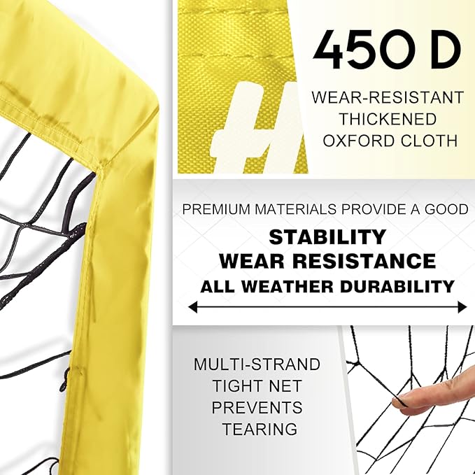 - 【Long-lasting Thickened Material】 The soccer goal is made of 450D thickened oxford cloth, 12mm high elastic fiberglass pole and strong 3-layer polyester soccer net. This ensures exceptional performance even against powerful shots, maintaining its all-weather durability and it won't fade or wear even if it is placed outdoor for a long time.