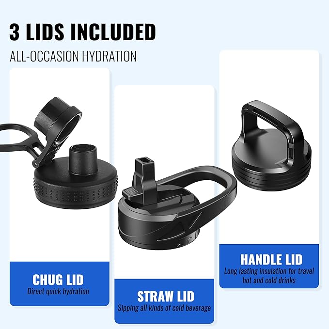 - 3 LIDS LEAKPROOF DESIGN: The 40 oz water bottle with straw is equipped with 3 individual wide-mouth lids to serve all hydration needs, Sip hot drinks, all caps allow for easy one-handed or hands-free sipping when you are busy or on-the-go