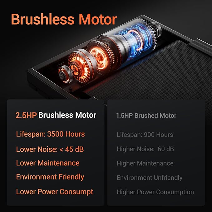 - 【Powerful and Quiet Brushless Motor】This treadmill for home features a high-cost brushless motor, which is more efficient than ordinary brushed motors. It delivers a maximum speed of 7.5 MPH with 3.0 HP, using less power. The motor's lifespan extends from 900 hours to 3500 hours, nearly four times longer! Additionally, noise levels are kept below 45DB, ensuring a quiet and comfortable exercise environment.