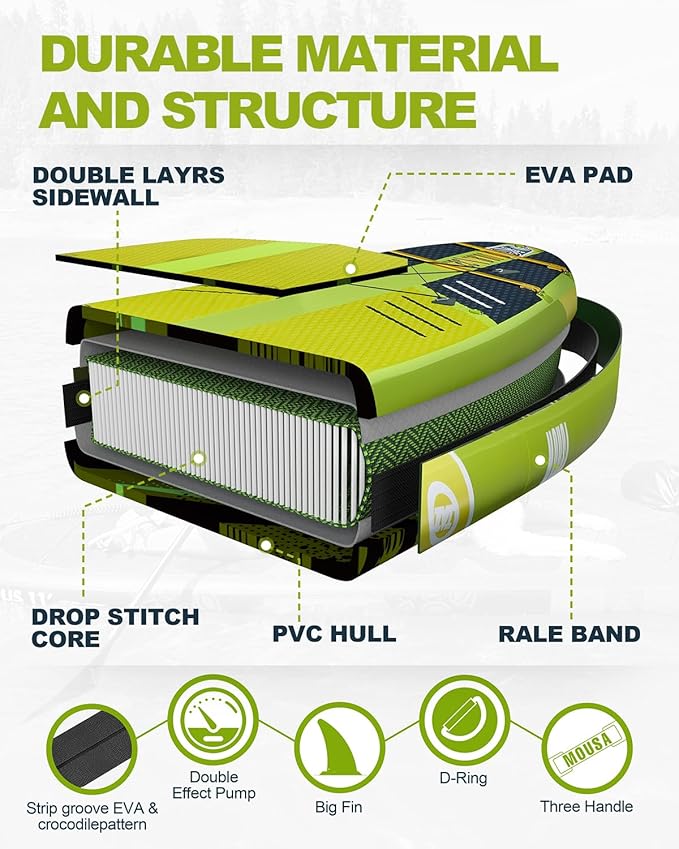 - RESISTANT & DURABLE MATERIAL >>> With 20 years of industry experience, we use trustworthy materials and double drop stitch core to improve wear resistance and durability by 30%. Double layers of rail are applied to reinforce this stand-up Sup inflatable cruiser.