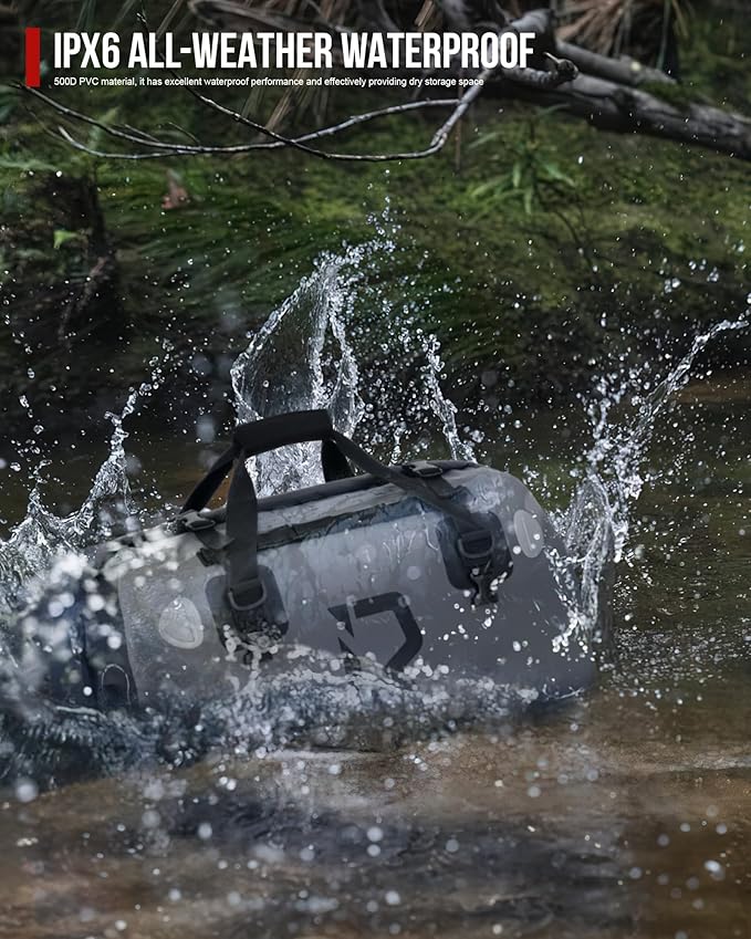 - 【Excellent waterproof property】Made with high-quality 501D PVC material, this bag features seamless sealing welding and a roll-top design that ensures complete protection against heavy rain. The Velcro closure at the top makes it easy to roll up and access your items quickly. This fabric withstands extreme temperatures, humidity, and UV exposure without cracking or deteriorating, making it perfect for long-distance travel. Your belongings will stay dry in any weather.
