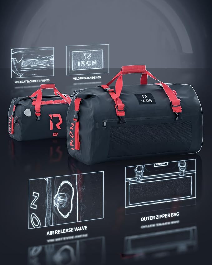 - 【Ample Capacity】This motorcycle tail bag comes in 30L, 50L, and 70L sizes, providing generous storage space. Internal pockets (30L fits a 15-inch tablet, while 50L and 70L fit a 31-inch tablet) and external mesh pockets offer extra storage options, helping you separate wet and dry items. Equipped with MOLLE attachment points for hanging keychains and water bottles, and an air valve to maximize capacity by releasing excess air.