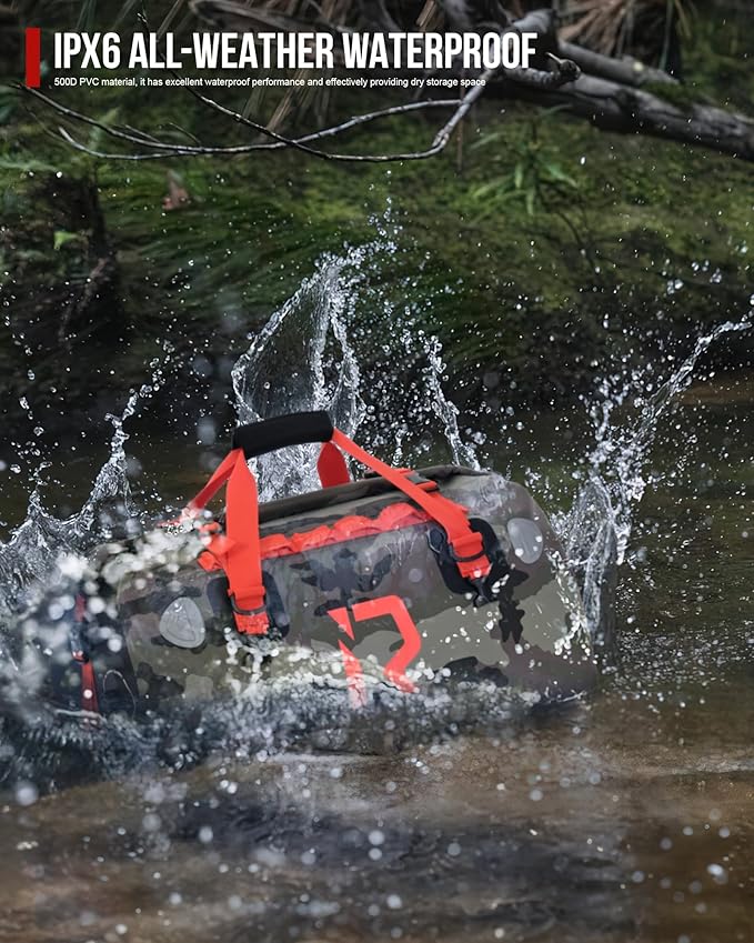 - 【Excellent waterproof property】Made with high-quality 507D PVC material, this bag features seamless sealing welding and a roll-top design that ensures complete protection against heavy rain. The Velcro closure at the top makes it easy to roll up and access your items quickly. This fabric withstands extreme temperatures, humidity, and UV exposure without cracking or deteriorating, making it perfect for long-distance travel. Your belongings will stay dry in any weather.