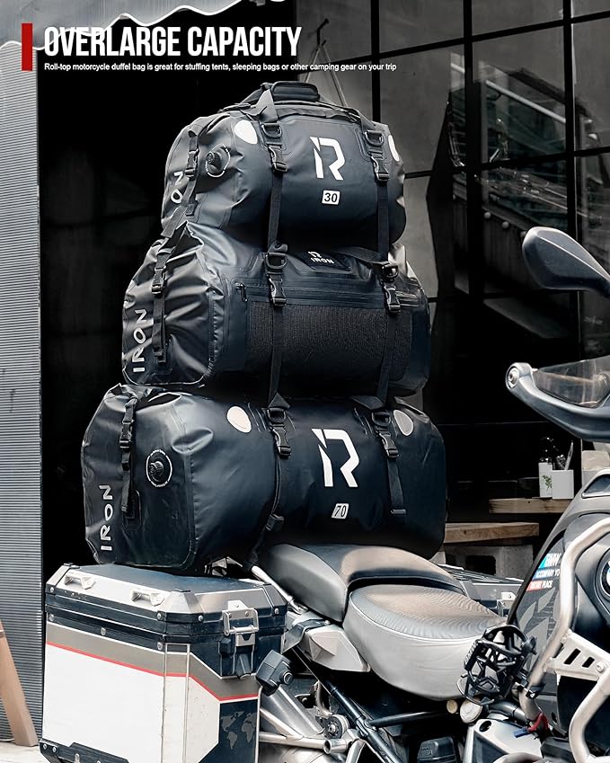 - 【Ample Capacity】This motorcycle tail bag comes in 30L, 50L, and 70L sizes, providing generous storage space. Internal pockets (30L fits a 15-inch tablet, while 50L and 70L fit a 24-inch tablet) and external mesh pockets offer extra storage options, helping you separate wet and dry items. Equipped with MOLLE attachment points for hanging keychains and water bottles, and an air valve to maximize capacity by releasing excess air.