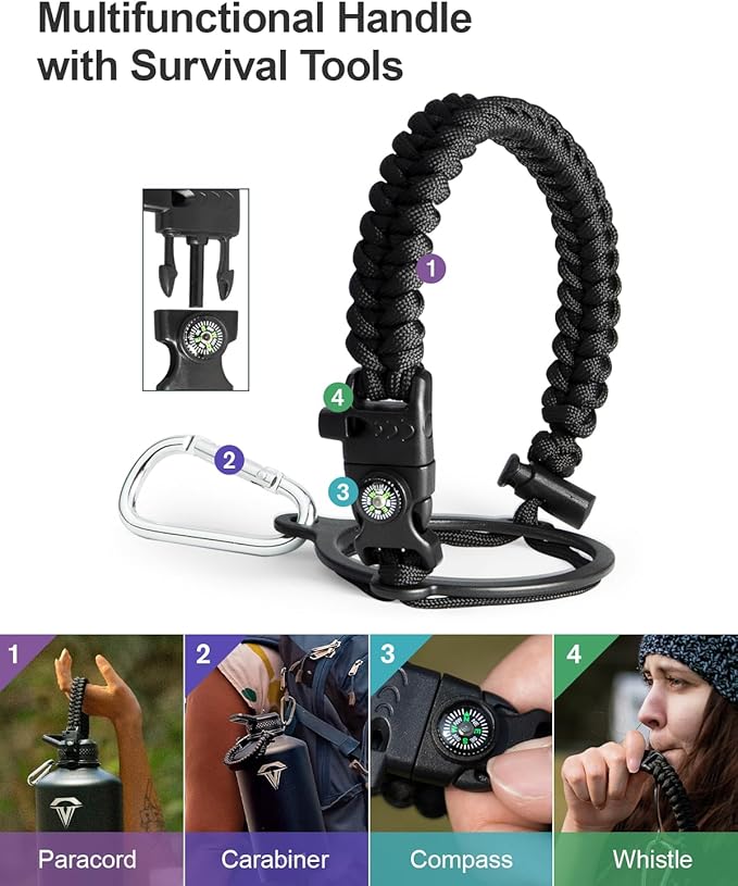 - Ready for adventures: The paracord handle is crafted from sturdy braided rope with an attached survival kit. This includes a compass, a whistle, and a clip, making it an ideal companion for any outdoor activity — be it camping,hiking or exploring new places through travelling.