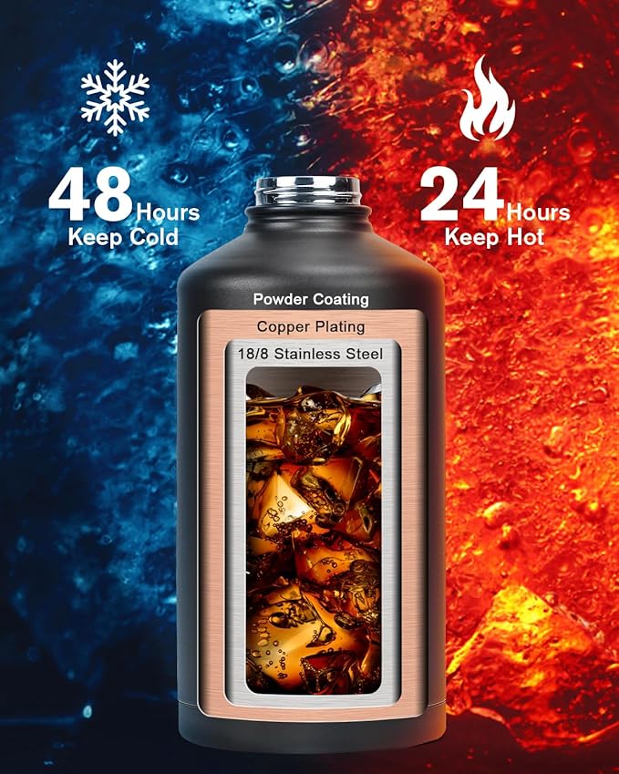- Cold for 48H & Hot for 24H:Topre 128 oz One Gallon Insulated Water Bottle features advanced triple-wall vacuum insulation with copper plating, the water flask preserve the freshness and temperature of your drinks throughout the day.