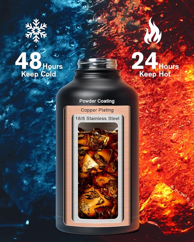 - Cold for 48H & Hot for 24H:Topre 64 oz Half Gallon Insulated Water Bottle features advanced triple-wall vacuum insulation with copper plating, the water flask preserve the freshness and temperature of your drinks throughout the day.