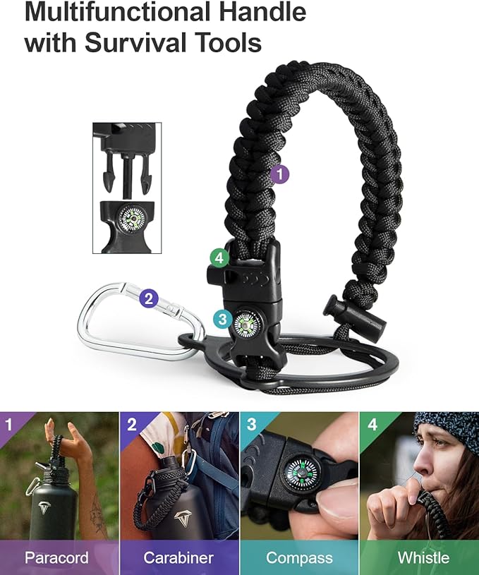- Ready for adventures: The paracord handle is crafted from sturdy braided rope with an attached survival kit. This includes a compass, a whistle, and a clip, making it an ideal companion for any outdoor activity — be it camping,hiking or exploring new places through travelling.