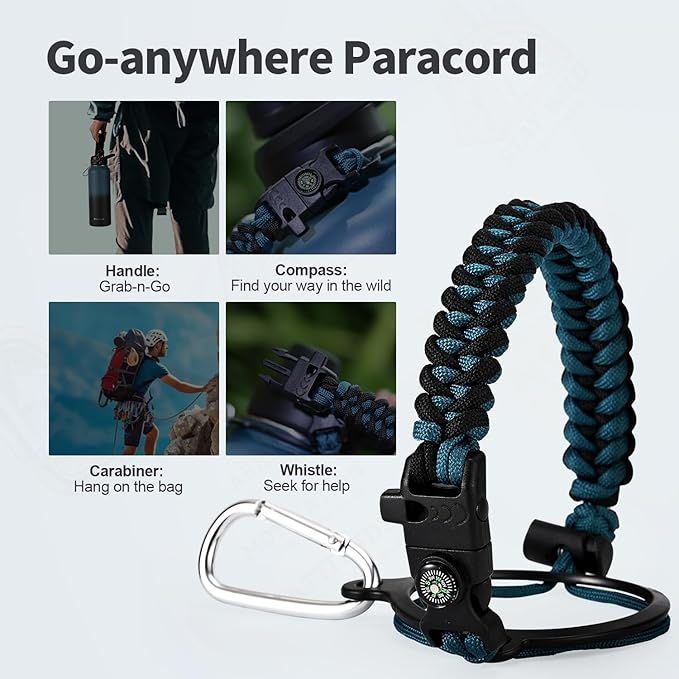 - Palm Fitting Paracord Handle: Compared to handle lids, nylon paracord on the bottle gives you more choices in terms of color coordination and coziness on your hands. Match the handle with your bottle to make a complete outdoorsy look. Compass and carabiner can be lifesavers for hiking and other expeditions