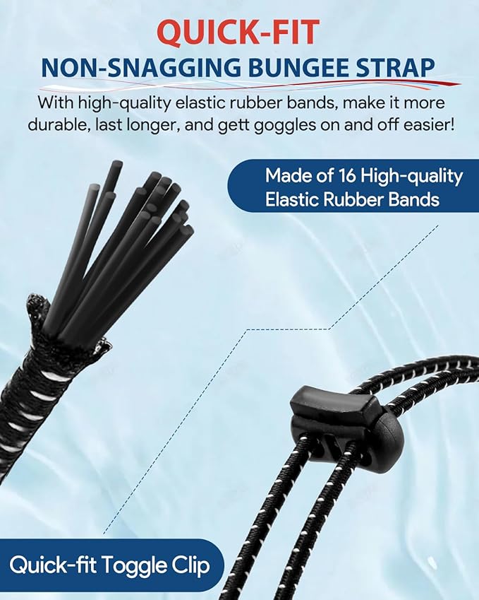 - Easy Adjust & No Hair-pulling: Otionus swim goggles feature a user-friendly strap design that allows easy tightness with a simple press, saving you time and eliminating worries about tangled hair. The bungee strap offers a superior alternative to traditional silicone straps, is made up of 16 ultra-soft rubber bands, providing a comfortable and non-adhesive feel.