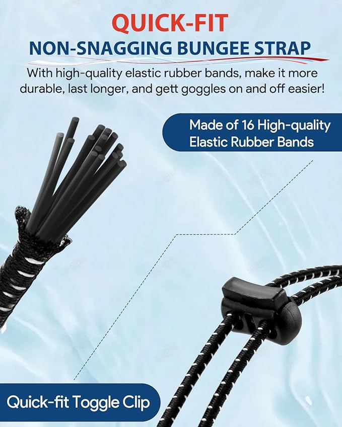 • Easy Adjust & No Hair-pulling: Otionus swim goggles feature a user-friendly strap design that allows easy adjustment of tightness with a simple press, saving you time and eliminating worries about tangled hair. Moreover, unlike conventional silicone straps, our bungee strap is made up of 16 ultra-soft rubber bands, providing a comfortable and non-adhesive feel.