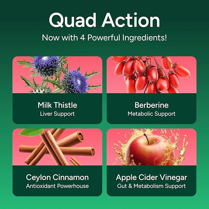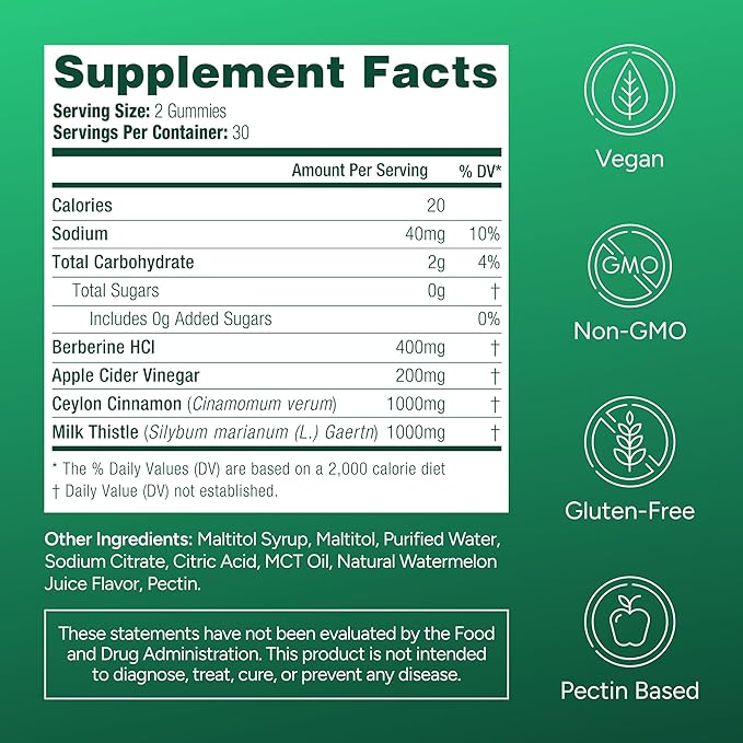 - [Synergistic Formula for Body Comp.]: Enjoy a sugar-free and potent formula that blends Berberine HCL (400mg), Ceylon Cinnamon (2000mg), Apple Cider Vinegar (200mg), and Milk Thistle (1000mg) in a nutritious gummy for better digestion and liver function.