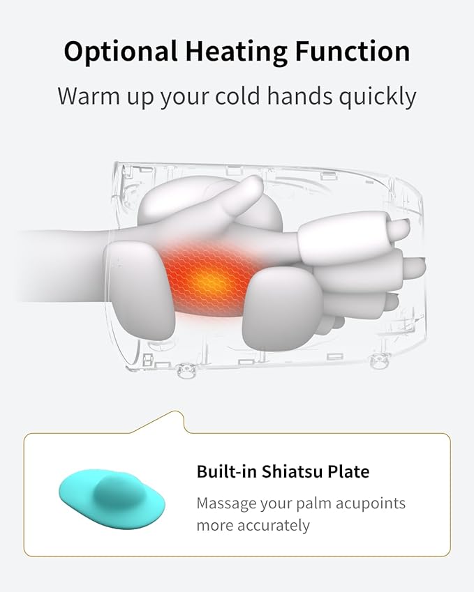 - Finger Wraps for More Relaxation - This upgraded version comes with more airbags to wrap your fingers and massage your knuckles more effectively. Built-in precise pressure point in palm will stretch and knead the muscles in your hands to the max. Your whole hand will be relaxed faster.