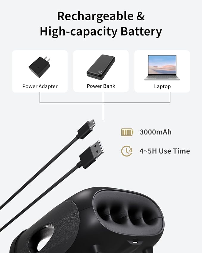 - Rechargeable & Portable -The cordless hand massager is portable and convenient to use at home, in the office or outdoors. Built-in rechargeable 3000mAh high-capacity battery can last 4-5 hours after full charging. There is 1 charging USB cable inside the package and it can be charged through the DC5V 2A chargers or your PC or power banks.