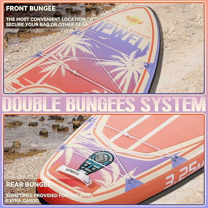 - 【PROFESSIONAL SUP DESIGN】UPWELL inflatable stand up paddle board is 10'8"x 33" x 6". It's weight capacity up to around 450lbs and wide design ensures higher stability and flexibility. Our unique design suitable for all beginners and all skill levels to explore and enjoy themselves in different water areas, such as ocean, lake and river, withstand both fresh and salt water. This is an all-around board that can be used for surfing, fishing, touring, yoga and family fun.