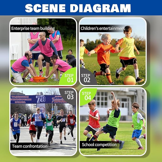 - 【Style Selection】---In order to meet the needs of different groups of people,our soccer training vests offer 4 color combinations(red+blue,yellow+blue,green+orange, red+blue+green+orange)and 3 types of quantity ratio(12pack/24pack/48pack) to choose from.
