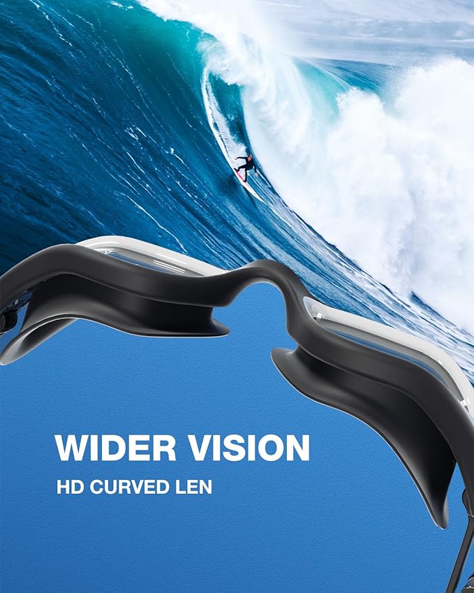 - Clear Panoramic View: Equipped with curved, high-definition lenses, the anti-fog goggles offer a wider peripheral vision. The 180° viewing angle ensures that you maintain visibility in crowded pools or open waters, keeping you safe at all times.