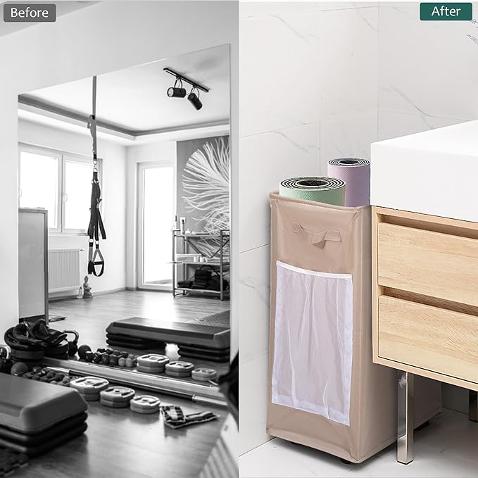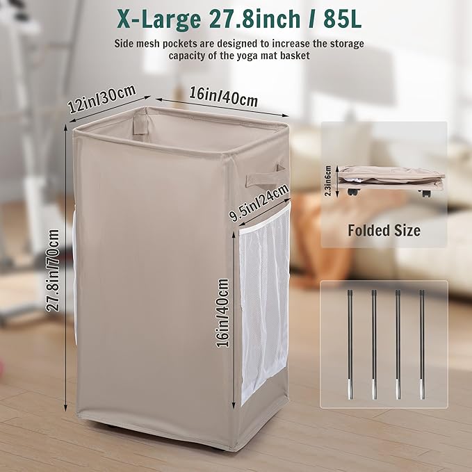 - WIDENED SIZE: Upgraded yoga mat basket with 85L capacity measures 16"(L) x 12"(W) x 27.8"(H) / 41x30x70CM can easily accommodate 4 different sizes of yoga mats, 2 foam rollers, as well as kettlebells, yoga bricks and more