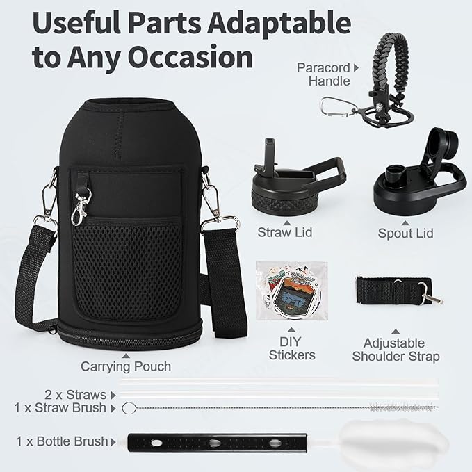 - After Services and Package: We offer continuous after-sales service against leakage and poor cold/hot-keeping capability, we are committed to 100% customer satisfaction. Your purchase includes: WixByti 64oz Water Bottle, Carrying Pouch with Adjustable Strap, Straw Lid with 2 Straws & 1 Straw Brush, Spout Lid, Paracord Handle, Water Bottle Stickers