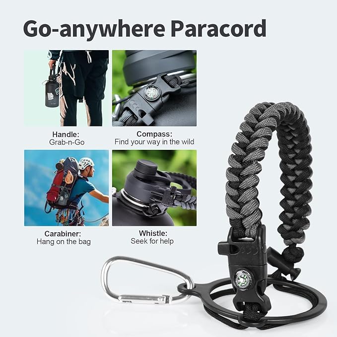 - Palm Fitting Paracord Handle: Compared to handle lids, nylon paracord on the bottle gives you more choices in terms of color coordination and coziness on your hands. Match the handle with your bottle to make a complete outdoorsy look. Compass and carabiner can be lifesavers for hiking and other expeditions