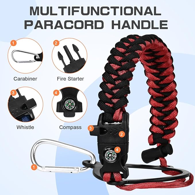 - Full-function Paracord - With brilliant matching colors brings a touch of youthful vibe to the 40 oz water bottle. As a sturdy survival handle it comes with a carabiner, compass, fire starter and whistle, perfect for your wild adventures hiking camping fishing.