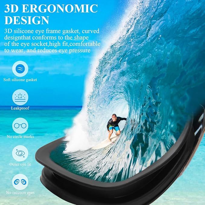 - NO LEAKING,FLEXIBLE & COMFORTABLE : Moderate gaskets fit for a wide range of faces.With a less restricting feel around eye sockets, it offers high degree of comfort and forms a solid seal so you never have to worry about water seeping in or red itchy eyes, In addition, the flexible silicone frame and improved higher nose rest provide extreme comfort and will never hurt your nose or leave marks on your face.