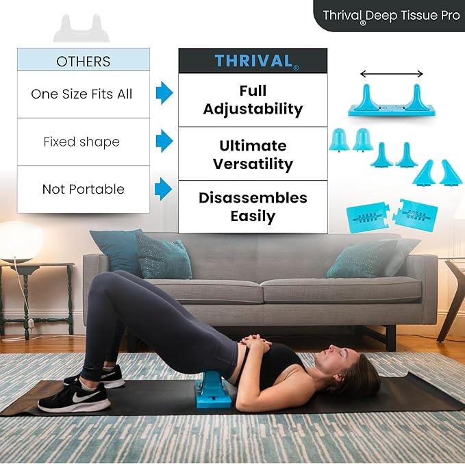 - Adjustability: Each attachment head locks into the release board, with the option of choosing one of five positions per side of the board. This allows you to customize the Thrival board to your anatomy as well as the muscle group that you are intending to release. The product's ease of use ensures that even those with limited mobility can effortlessly incorporate it into their daily routine.