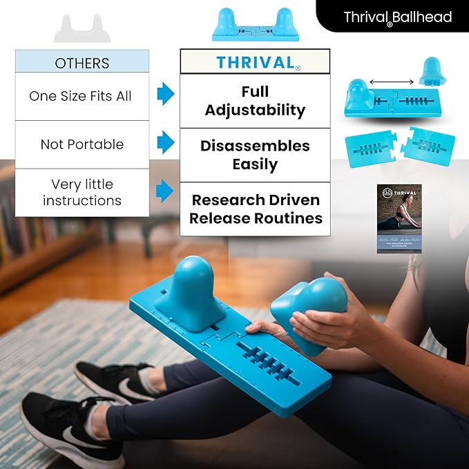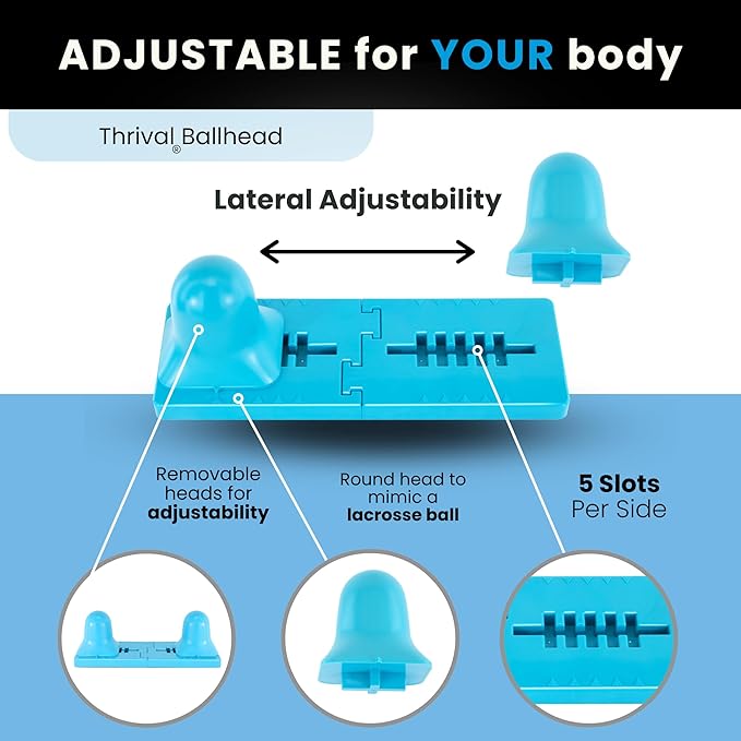 - Adjustability: Each attachment head locks into the release board, with the option of choosing one of five positions per side of the board. This allows you to customize the Thrival board to your anatomy as well as the muscle group that you are intending to release. The product's ease of use ensures that even those with limited mobility can effortlessly incorporate it into their daily routine.