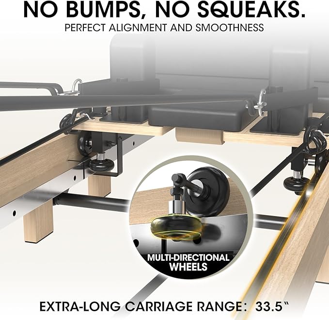 - [PROFESSIONAL PERFORMANCE]: Our pilates machine features a durable solid oak frame supporting up to 500 lbs, with a spacious body and extended carriage for enhanced range of motion. Multi-directional wheels and smooth tracks ensure seamless movement. Equipped with 6 premium wire springs and dual hook rows, it offers varied resistance options tested for durability over 60,000 cycles. High-density foam padding on the carriage and foot bar ensures superior comfort during workouts.