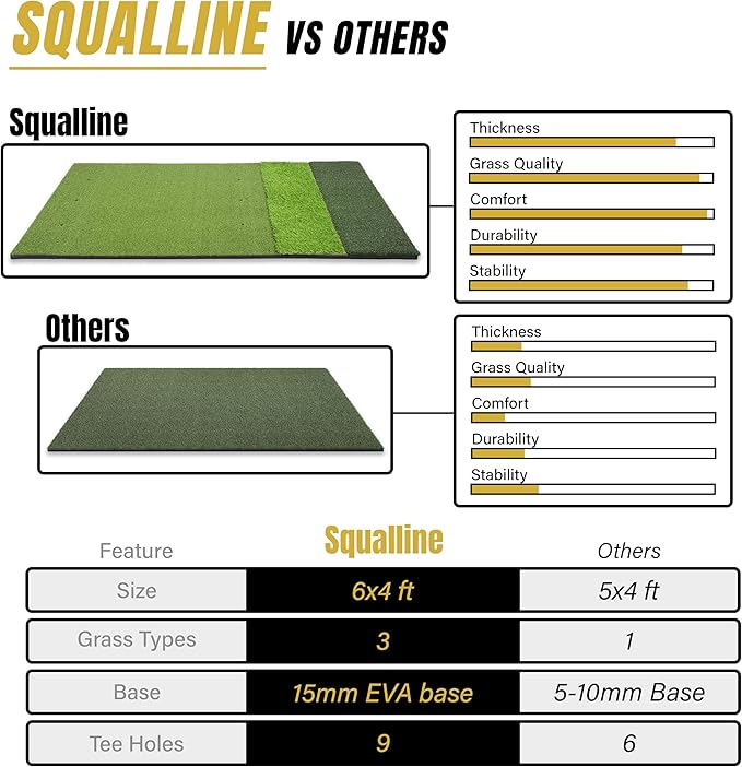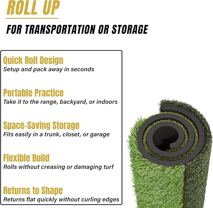 - ๐๐ผ๐น๐ณ ๐ ๐ฎ๐ ๐ฆ๐ฝ๐ฒ๐ฐ๐ถ๐ณ๐ถ๐ฐ๐ฎ๐๐ถ๐ผ๐ป๐: 6x4 ft mat with a thick 15mm EVA base. Features 15mm fairway turf (4x4ft area), 40mm rough turf (1x4ft area), and 40mm dense tee turf (1x4ft area).