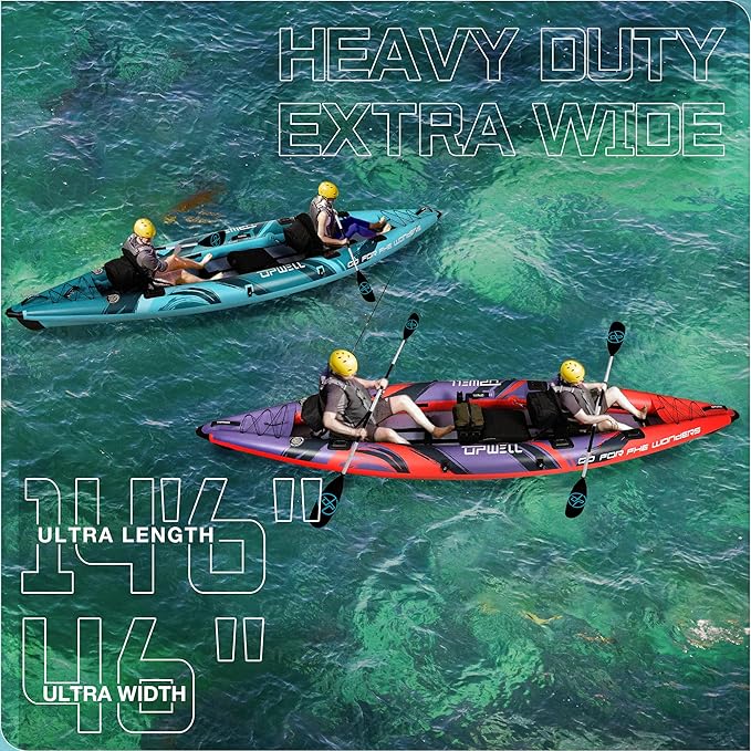 - PROFESSIONAL 2+1 DESIGN:The inflatable recreational kayak from UPWELL, it's 14'6" long x 46" wide x 12" height, weighs 40 lbs. The weight capacity up to around 700 lbs, making it lightweight for portability and especially suited for two or more who needs a tandem. The inflatable kayak is designed for all skill levels to explore in different areas for traveling and touring