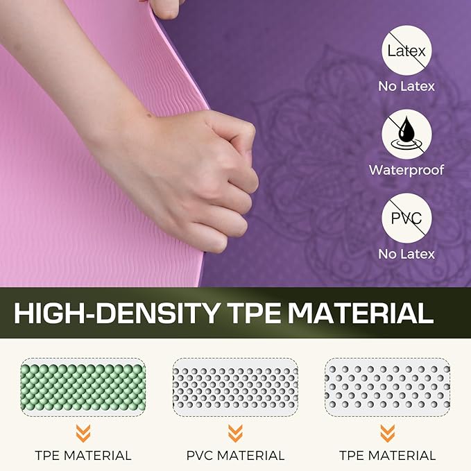 - 【TPE Exercise Mats】We selected TPE material carried out the technical improvements basic on traditional workout mats. Our TPE yoga mats are non-toxic, polymer material waterproof and sweat-proof, and easy to clean, better abrasion than PVC, EVA and NBR mats