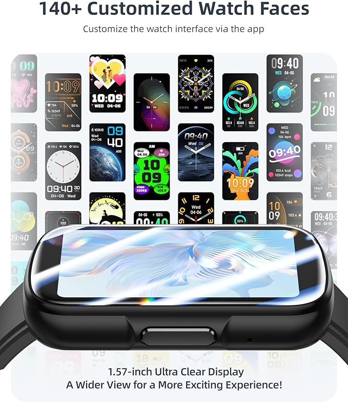 - 【1.57" ULTRA HD SCREEN & ULTRA-LIGHT COMFORT】Upgrade your lifestyle with this ultra-comfortable smartwatch! Its lightweight, skin-friendly silicone strap ensures all-day comfort. The 1.57-inch ultra HD screen offers excellent brightness, making every notification, call, and message easy to read and use. Perfect for work, workouts, or socializing, this watch enhances your style and showcases your personality. Choose this pedometer watch today and embrace a healthier, more fashionable life!