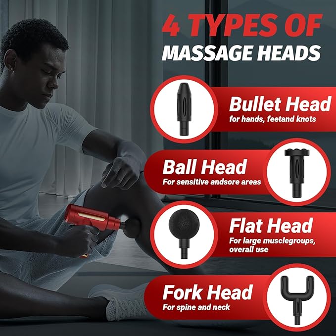 - 【4 Different Massage Heads】This precision massage gun set includes 4 standard massage heads to suit your different needs and relax your body by targeting different muscle groups to relieve your stress and enhance sleep. The noise level is less than 40 decibels, , and it will not disturb others during use.