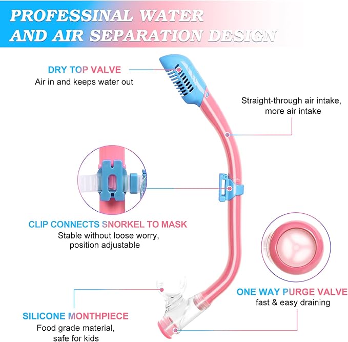- 【DRY TOP SNORKEL & PURGE VALVE】The Snorkel adopts the most stable dry float valve design. When immersed in water, the top float valve will close automatically to prevent water from entering the breathing tube, the lower purge valve can quickly drain water, so that children will not be choked by water. Food grade soft liquid silicone mouthpiece is durable and safe for children to use.