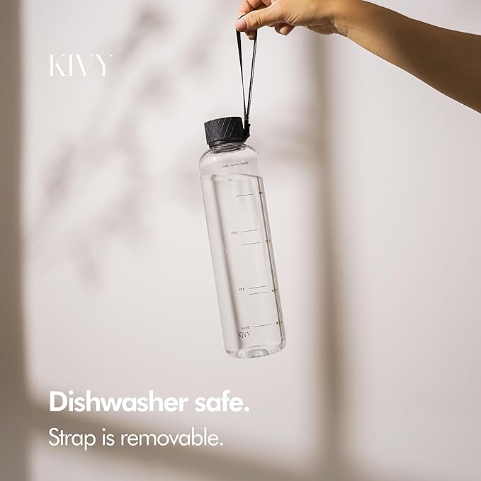 - DISHWASHER SAFE: The transparent water bottle with screw top is dishwasher safe, and the lid + strap are easy to clean by hand. The aesthetic water bottle is completely BPA-free and non toxic.
