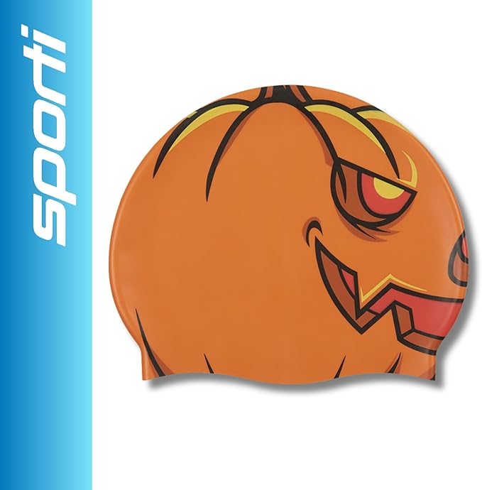 - Spooky Design: Inspire your little swimmer with the Sporti Pumpkin Head Silicone Swim Cap Jr. This kids swimming cap showcases a fun jack-o-lantern graphic, making it a perfect choice for Halloween or any day to spook the competition!