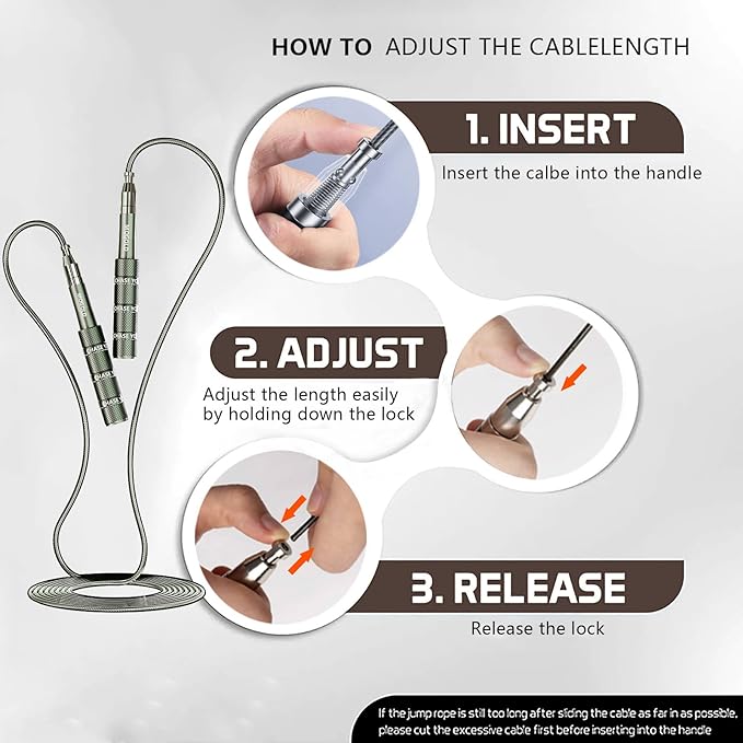 - 【Self-Locking and Screw-Free】The design of self-locking and screw-free make the fitness jump rope easy to adjust the length without cutting with pliers and locking with screws, only need to press the handle end to insert or take out the cable. The maximum adjustable length of this skipping rope up to 14 inches by trim, perfect for kids, women and men rope skipping.