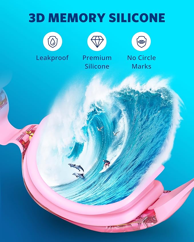 • Great Seal & No Leaking-The ergonomic design of swim goggles with high-quality silicone material ensures a close fit to different face shapes and never allows leakage. In addition, the flexible silicone frame and improved higher nose rest provide extreme comfort and will never hurt your nose or leave marks on your face.