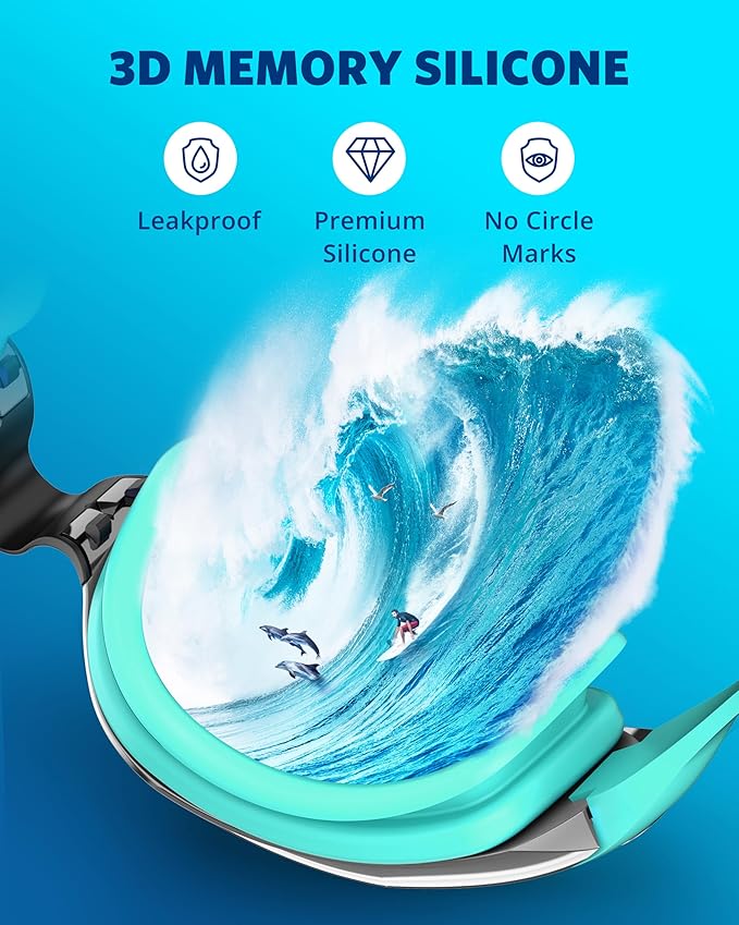 • Great Seal & No Leaking-The ergonomic design of swim goggles with high-quality silicone material ensures a close fit to different face shapes and never allows leakage. In addition, the flexible silicone frame and improved higher nose rest provide extreme comfort and will never hurt your nose or leave marks on your face.
