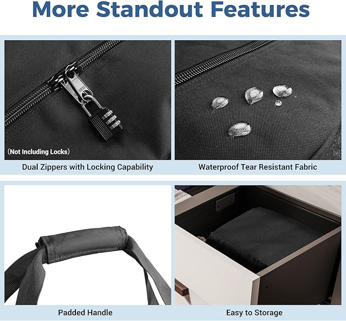 - Made of Sturdy, water-resistant 600 denier fabric material with premium heavy duty metal SBS 2-way lockable zippers(Not Including Locks). The padded shoulder strap for total comfort, the sturdy polyester body makes this duffle bag ideal for long-term use